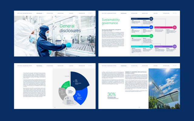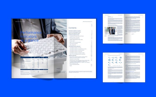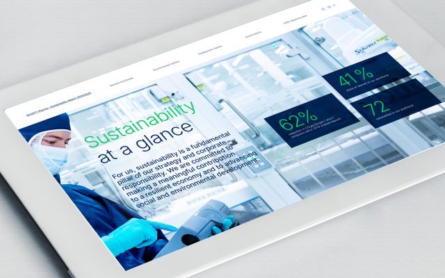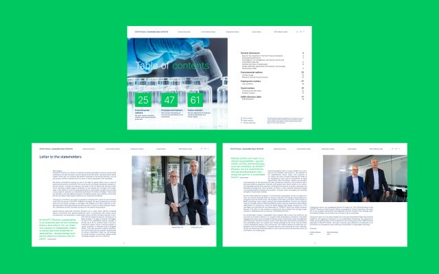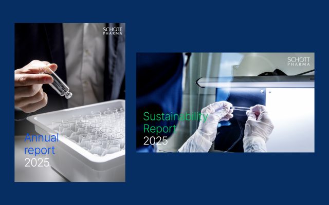 Akzente setzen wir entsprechend den neuen Corporate Colors von Schott Pharma im Geschäftsbericht in leuchtendem Blau und im Nachhaltigkeitsbericht in intensivem Grün.